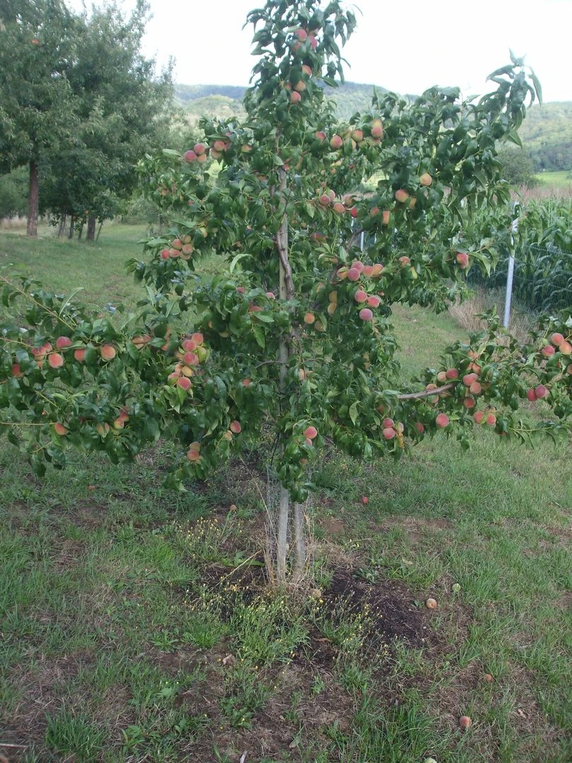 Frucht: Gelbe Grundfarbe mit überwiegend roter Deckfarbe. Gut steinlösendes, weißes Fruchtfleisch mit süßem Pfirsicharoma. Reifezeit bereits Ende Juli / Anfang August.