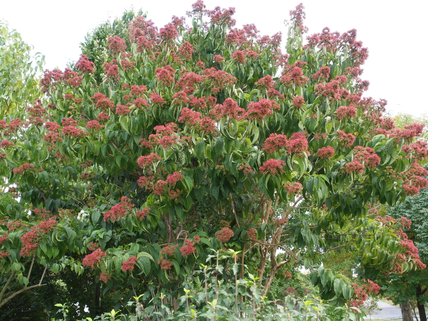 Ein absoluter Geheimtipp unter den Ziergehölzen ist diese Besonderheit aus dem fernen Osten. Erst seit kurzer Zeit wird diese Pflanze auch in Europa kultiviert. Das Spezielle ist unter anderem die späte Blütezeit im Herbst, wenn kaum noch andere Pflanzen im Garten zu finden sind, fällt der Sieben-Söhne-des-Himmels-Strauch ganz besonders durch seine üppige Blüte auf. Es handelt sich um einen halb-immergrünen Strauch, der breit und aufrecht wächst. Er wird je nach Standort ca. 2 m hoch. Die Blätter sind dunkelgrün und sehr dekorativ. Ab August erscheinen die weißen, wunderbar duftenden Blüten. Die Blüte reicht bis in den November hinein, im Anschluß entwickeln sich noch rötliche Fruchtdolden (s. Bild). Der Strauch beginnt dann sehr früh mit dem Neuaustrieb. Die Pflanze ist robust und winterhart, sollte aber nach Möglichkeiteinen windgeschützten Standort erhalten.